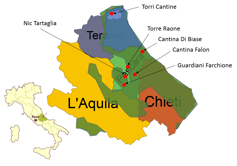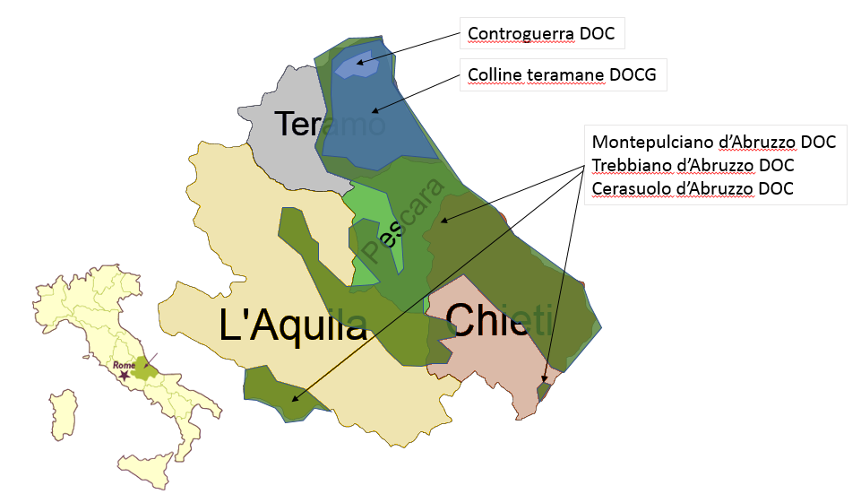 Les Abruzzes possèdent environ trente mille hectares de vignobles. On y retrouve 5 DOCs: Abruzzo (Montepulciano d’Abruzzo, Trebbiano d’Abruzzo, Cerasuolo d’Abruzzo, Pecorino d’Abruzzo), Controguerra, Terre Tollesi, Ortona, Villamagna, ainsi qu’une DOCG: le Montepulciano d’Abruzzo Colline Teramane. Aux côtés de ces DOCs, la région compte également 8 « Indicazione Geografica Tipica (IGT) » : Colline Aprutini, Colline del Sangro, Colline Frentane, Colline Pescaresi, Colline Teatine, Vastese (ou Histonium), Terre di Chieti et Valle Peligna.